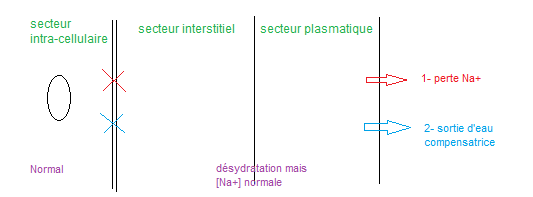 Perte nette de sodium accompagné d’une perte d’eau de manière équivalente, aboutissant à une DEC isolée. La natrémie est donc normale au début (pas de modification de l’osmolalité donc pas de modification du secteur intracellulaire)219 DEC