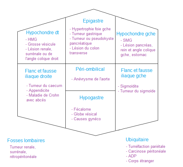 Déf : Tuméfaction abdominale, excluant les hernies et la palpation physiologique des organes (surtout chez les sujets maigres).