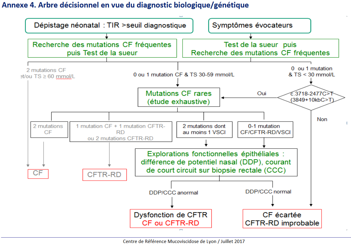 Les sources utilisées pour cette fiche sont équivoques dans la démarche diagnostique. Dans tous les cas, le test à la sueur est réalisé après la recherche de mutations fréquentes dans le cas du dépistage néonatal.
