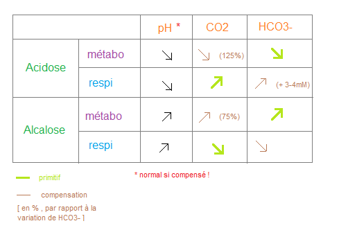 (en cas de trouble compensé, la différence entre acidose métabo / alcalose respi ou acidose respi / alcalose métabo n’est pas évidente !)
